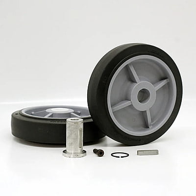 Non-marking thermoplastic elastomer tread is permanently bonded to durable polyolefin wheel core. The rubber is 65 ±5 Durometer Shore A scale. No keyway is provided in these wheels, depending on your application, you may need to add a keyway yourself.